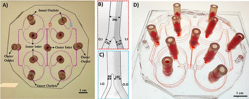 In singleplex solutions, 10 and 5 μm particles selectively migrated to inner and outer outlets, demonstrating separation efficiencies of 99.7% and 90.3%, respectively. With duplex samples, sample purity was measured to be 93.4% and 98.6% for 10 and 5 μm particles collected from the inner and the outer 24 outlets, respectively. Application of our device in biological assays was shown by performing duplex experiments where 10 μm particles were isolated from Salmonella bacterial suspension with purity of 97.8% while increasing the state-of-the-art particle solution exchange and separation throughput by 16 folds. This parallelization enabled desirable combinations of high throughput, low-cost, and scalability, without compromising efficiency and purity, paving the way for sample preparation at the PoN in the future.