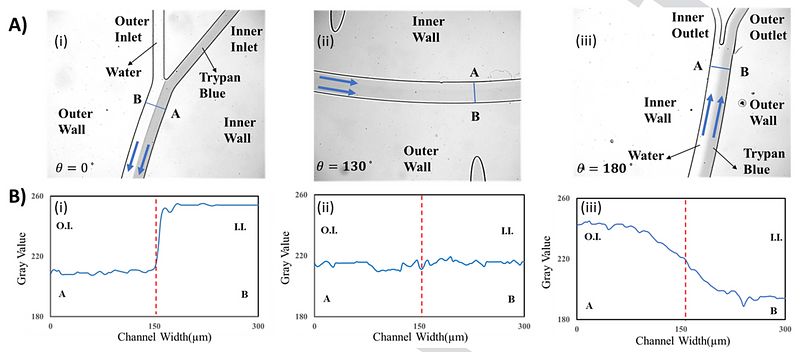 Co-flow images of trypan blue and undyed DI water at a total flow rate of Qt = 3.2 ml/min along the microchannel length at three angular distances (i.e., θ = 0°, θ = 130°, and θ = 180°). (Biomicrofluidics, 2024)
