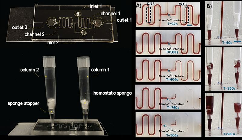 Severe bleeding is a leading cause of death worldwide, accounting for 45% of prehospital deaths and 39% of deaths within the first 24 hours after hospital arrival. Hemostatic materials are designed to accelerate blood clot formation and mitigate severe bleeding. Traditionally, their efficacy has been tested using animal hemorrhage models. I introduced a novel microfluidic device that measures clotting time of blood in contact with hemostatic materials, offering efficacy data under physiologically relevant conditions. This cost-effective and easy-to-use device provides a novel approach to characterize the performance of hemostatic biomaterials and drugs, reducing reliance on animal models and ensuring more controlled efficacy testing.