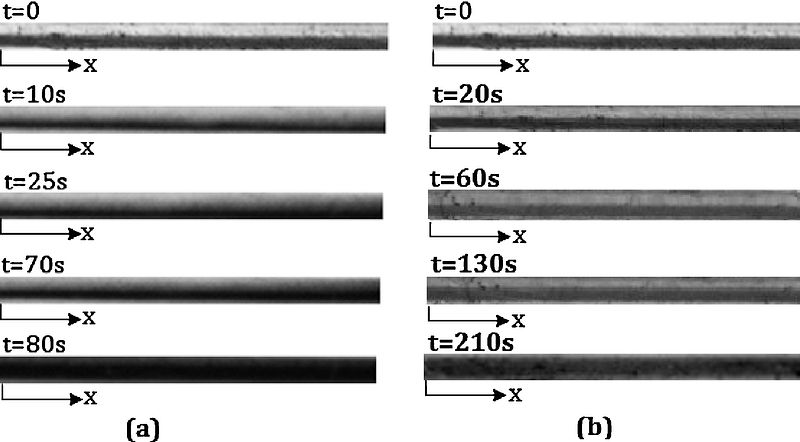 Time evolution of the mixing process for a flow rate of 60 cc/min and a nanoparticle mass fraction of 0.05 with (a) and without (b) the magnet. (Sensors & Actuators, 2017)