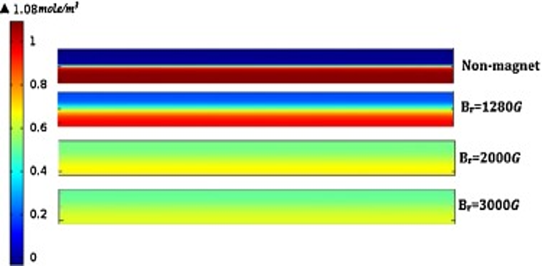 Concentration distribution for a length of 8 mm at the end of microchannel for different magnetic field's strengths (Sensors & Actuators, 2017)